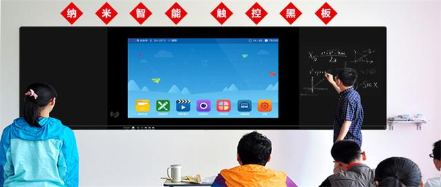 “纳米黑板”是一款高科技的互动教学产品,它集黑板、触摸液晶显示屏、电脑、音响、投影仪、白板等诸多功能设备于一体。