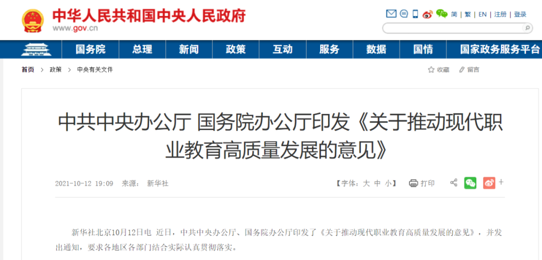 内容摘要:10月12日,中共中央办公厅、国务院办公厅印发了《关于推动现代职业教育高质量发展的意见》。内容指出,未来3-5年将是职业教育发展的黄金时期,各大厂家应重点关注在先进制造、新能源、新材料、现代农业、现代信息技术、生物技术、人工智能等产业具有较完善资质的职业教育机构/院校。