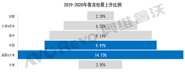 到2025年,职业教育类型特色更加鲜明,现代职业教育体系基本建成,技能型社会建设全面推进。办学格局更加优化,办学条件大幅改善,职业本科教育招生规模不低于高等职业教育招生规模的10%,职业教育吸引力和培养质量显著提高。除了政策方面的推动,国家在教育资金方面也大力投入,2020年普通高职高专教育经费总投入为2758亿元,比上年增长14.73%,在各教育阶段中增长幅度最大。